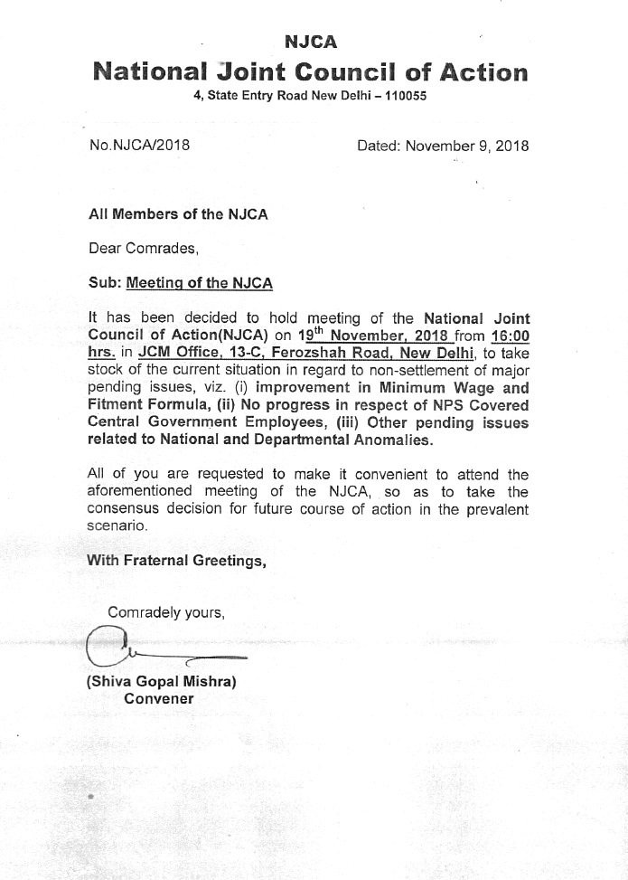 It has been decided to hold meeting of the National Joint Council of Action(NJCA) on 19th November, 2018 from 16:00 hrs. in JCM Office, 13-C, Ferozshah Road, New Delhi to take stock of the current situation in regard to non-settlement of major pending issues, viz. (i) improvement in Minimum Wage and Fitment Formula, (ii) No progress in respect of NPS Covered Central Government Employees, (iii) Other pending issues related to National and Departmental Anomalies.