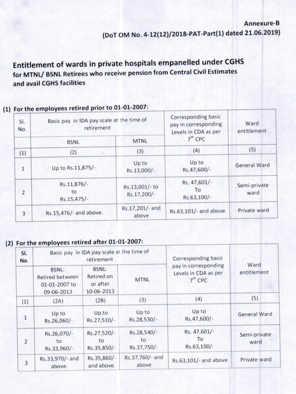 3. Accordingly, Annexures to the said O.M. dated 31.8.2016 stand revised as enclosed w.e.f. 1.1.2017 to enable CGHS in deciding the rate of CGHS contribution and ward entitlement in respect of retired BSNL/MTNL employees who receive pension from Central Civil Estimates and avail CGHS facilities.