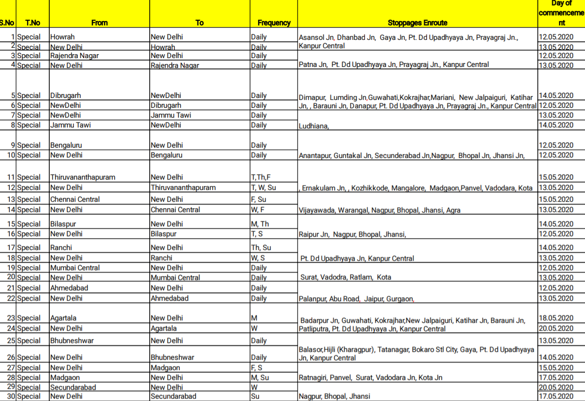 Special trains list by IRCTC from 12th May 2020 – PIB