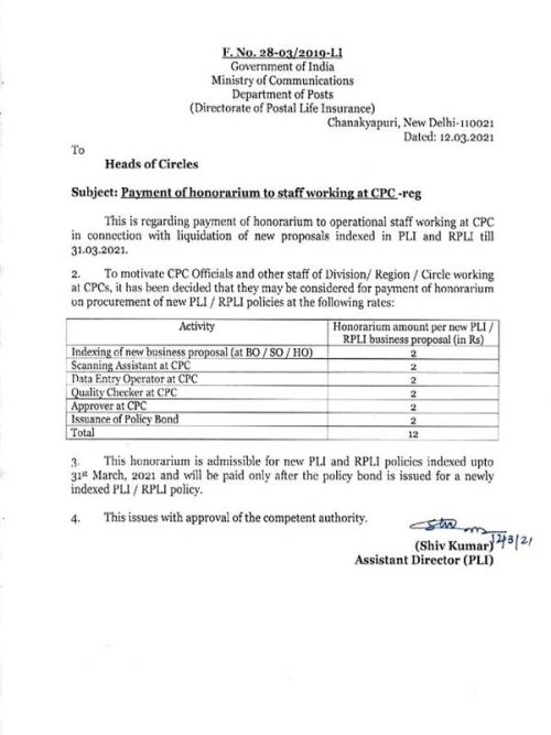 3. This hunorarium is admissible for new PLI and RPLI policies indexed upto 31st March, 2021 and will be paid only after the policy bond is issued for a newly indexed PLI / RPLI policy.