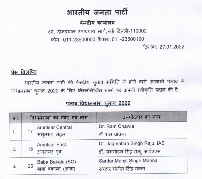 Download Punjab BJP Third Candidate List of 2022 PDF